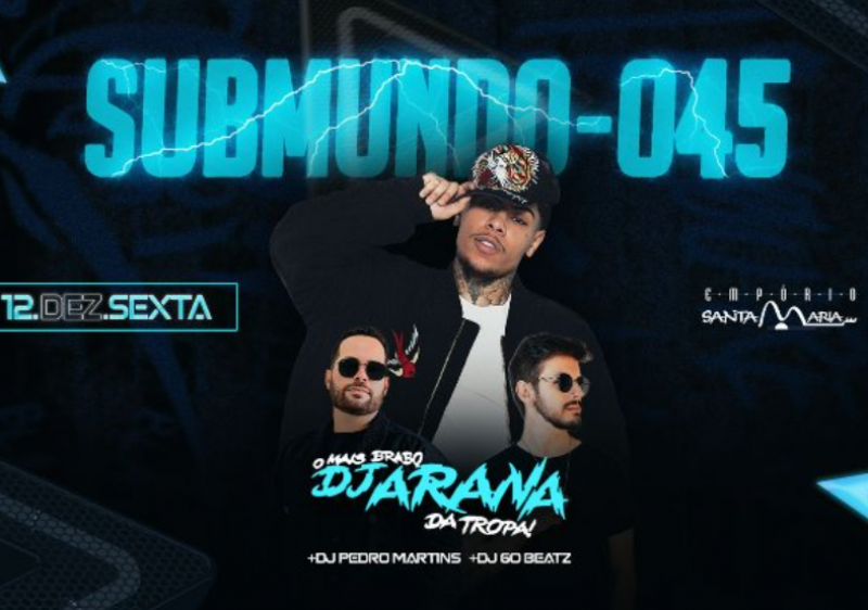 SUBMUNDO 045 - DJ ARANA + DJ PEDRO MARTINS + DJ GO BEATZ 12/12 Empório Santa Maria Valores de ingressos consultar em mais informações MAIS INFORMAÇÕES