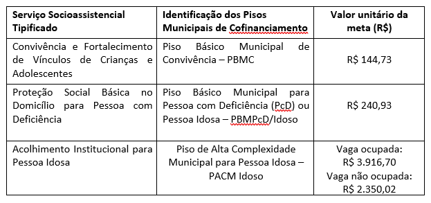 Os repasses do cofinanciamento dos Serviços Sociais Assistenciais de Caráter Contínuo serão reajustados, de acordo com o projeto. Os valores unitários serão atualizados para:
