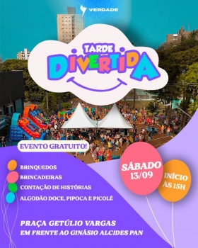 A Praça Getúlio Vargas, em frente ao Ginásio de Esportes Alcides Pan, será palco neste sábado, dia 13 de setembro, da 8ª edição do evento “Tarde Divertida”, uma iniciativa gratuita que promete reunir famílias e oferecer momentos de lazer e integração comunitária. A programação ocorrerá das 15h00 às 19h00.