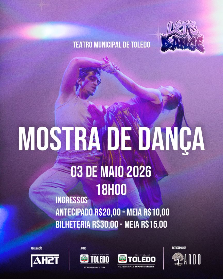 No dia 29 de abril foi comemorado o Dia Internacional da Dança, e para celebrar essa data tão notória é realizado o Let’s Dance, que vai ocorrer nos dias 01, 02 e 03 de maio. A 11ª edição do evento vai contar com workshops, batalhas e mostra competitiva e avaliativa de dança. O evento é uma realização independente da AH2T com apoio da Secretaria Municipal de Cultura de Toledo e do Programa Esporte Cidadão da Secretaria Municipal de Esportes e Lazer de Toledo (Smel), além de demais patrocinadores.