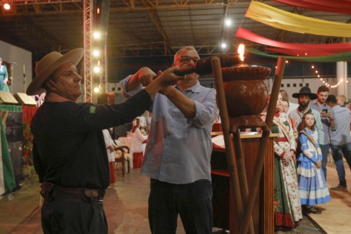 A 16ª Semana Farroupilha de Toledo foi aberta na noite desta quarta-feira (17), no Centro de Eventos Ismael Sperafico. A solenidade contou com a condução da Chama Crioula pela comitiva Marca de Casco e o acendimento no interior do espaço pelo prefeito Mario Costenaro, ao lado do patrão do Centro de Tradições Gaúchas (CTG) Chama Crioula, Adilson Fernando Gonçalves.