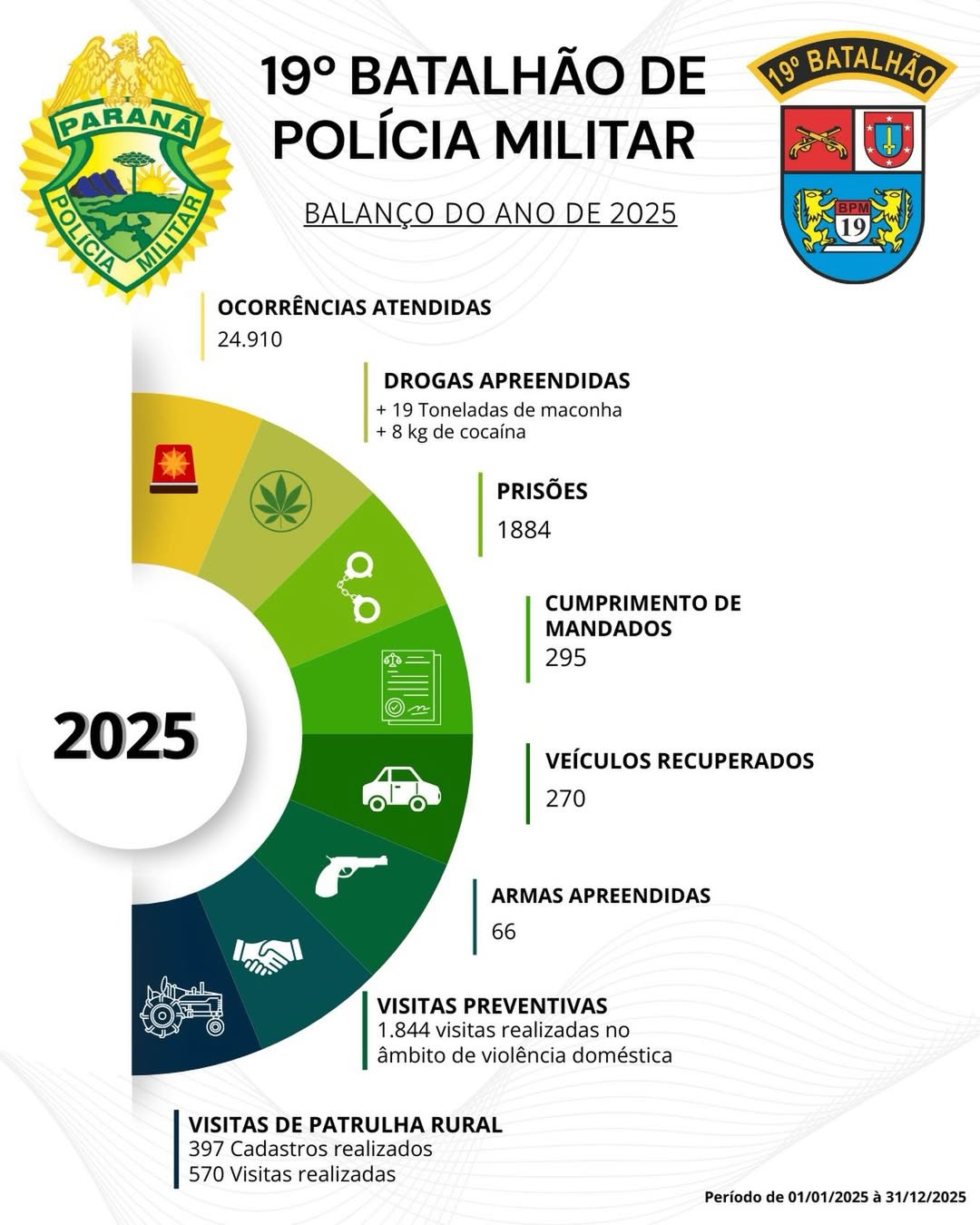 O 19º Batalhão de Polícia Militar de Toledo (19º BPM) apresentou o balanço das atividades desenvolvidas ao longo de 2025, destacando um ano marcado por intenso trabalho, dedicação e compromisso com a segurança da comunidade atendida pela unidade. Os dados refletem o empenho diário dos policiais militares no combate à criminalidade, na preservação da ordem pública e na proteção da sociedade.