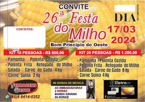 No próximo domingo, 17 de março, a comunidade do distrito de Bom Princípio do Oeste, em Toledo, reúne moradores e visitantes para a 26ª Festa do Milho.