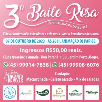 O Jantar Dançante Beneficente promovido pelo Coral Encanto de Viver, intitulado “Baile Rosa” será realizado neste sábado (07) junto ao Clube Querência Amada.
