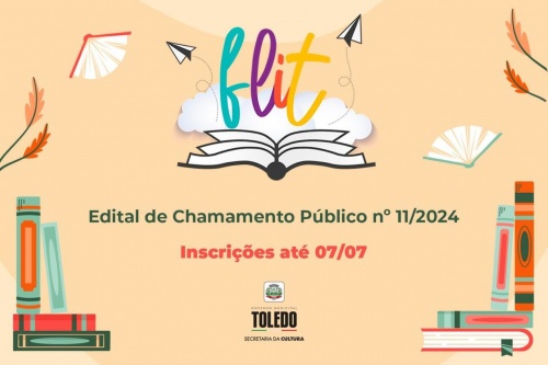 A Secretaria Municipal da Cultura de Toledo comunica que já está publicado o Edital de Chamamento Público nº 011/2024, que tem o objetivo de fazer o credenciamento de sebos, livrarias, livreiros e distribuidores de livros de Toledo e região que têm o interesse de serem expositores na Feira do Livro. O evento será realizado na Praça Willy Barth entre 12 a 18 de agosto, durante a 3ª Festa Literária de Toledo (Flit).