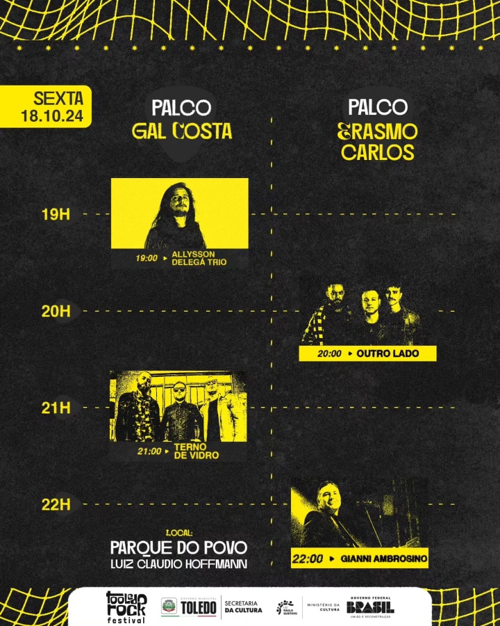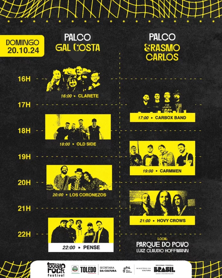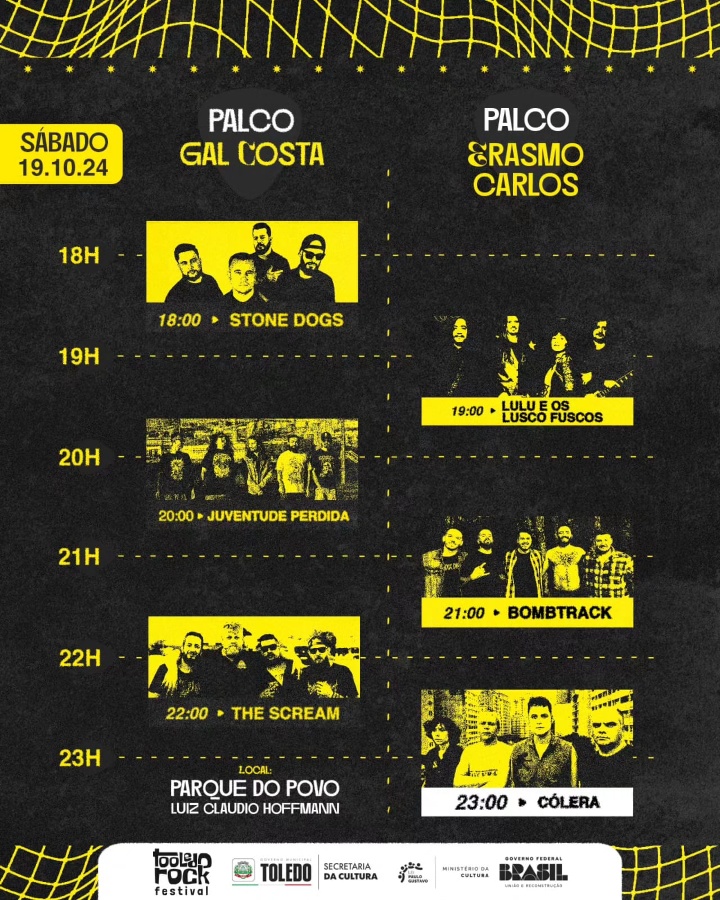O aguardado 3º Tooledo Rock Festival terá início nesta sexta-feira, dia 18 de outubro, e seguirá até domingo, 20 de outubro, no Parque do Povo Luiz Cláudio Hoffmann, no Jardim Planalto. O evento traz um line-up de peso, com 17 bandas que se apresentarão em dois palcos batizados em homenagem a grandes ícones da música brasileira: Gal Costa e Erasmo Carlos.