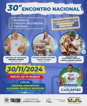 O Mestre Carlinhos e o Projeto de Capoeira Entra Nessa Roda estão organizando o 30° Encontro Nacional de Capoeira, que será realizado nos dias 30 de novembro e 01º de dezembro de 2024.