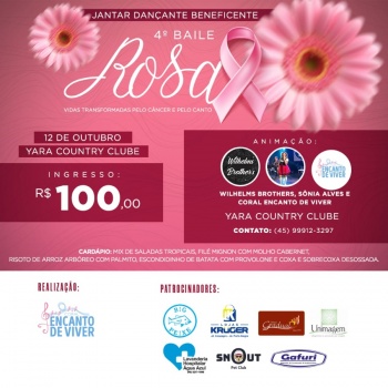 O Jantar Dançante Beneficente promovido pelo Coral Encanto de Viver, intitulado “Baile Rosa” será realizado no sábado 12 de outubro, feriado do Dia de Nossa Senhora de Aparecida, no Yara Country Clube, em Toledo.