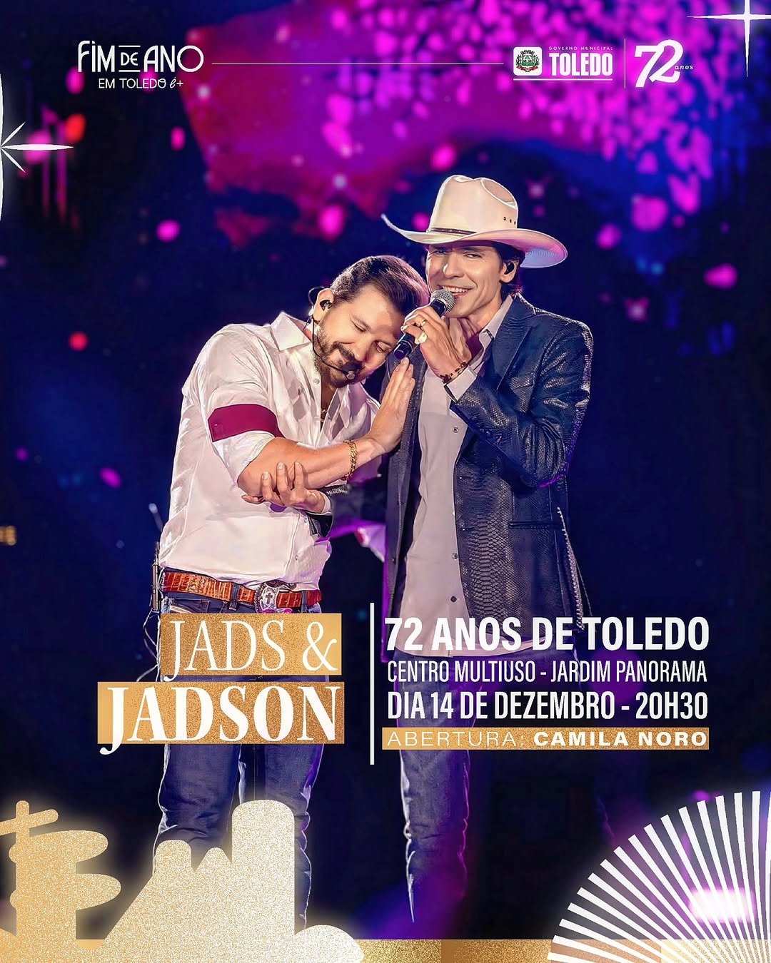Este sábado (14) promete muita emoção no Centro Multiuso, no Jardim São Francisco, onde Jads & Jadson se apresentam às 20h30, após a abertura de Camila Noro. Com hits como "Jeito Carinhoso" e "Noite Fracassada", a dupla traz o sertanejo para a festa de aniversário da cidade.