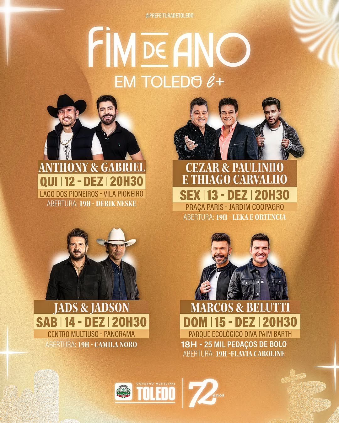 Confira a programação completa dos Shows de Aniversário - 72 Anos de Toledo