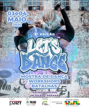 Nos dias 03 e 04 de maio o Teatro Municipal de Toledo vai receber dançarinos, grupos e escolas de nosso município e região para participarem do Let’s Dance, que têm em sua programação oficinas/workshops gratuitos, e apresentações na Mostra de Dança. O evento que está em sua 9ª edição e é realizado pela Associação de Hip Hop e Fórum de Dança com apoio do Ministério da Cultura através da Lei Paulo Gustavo, conta ainda com a Pixain Battle na programação, batalha de Breaking e Open Style que recebe dançarinos de todo o estado para competir aos olhos de um time de jurados composto por artistas de alto nível.