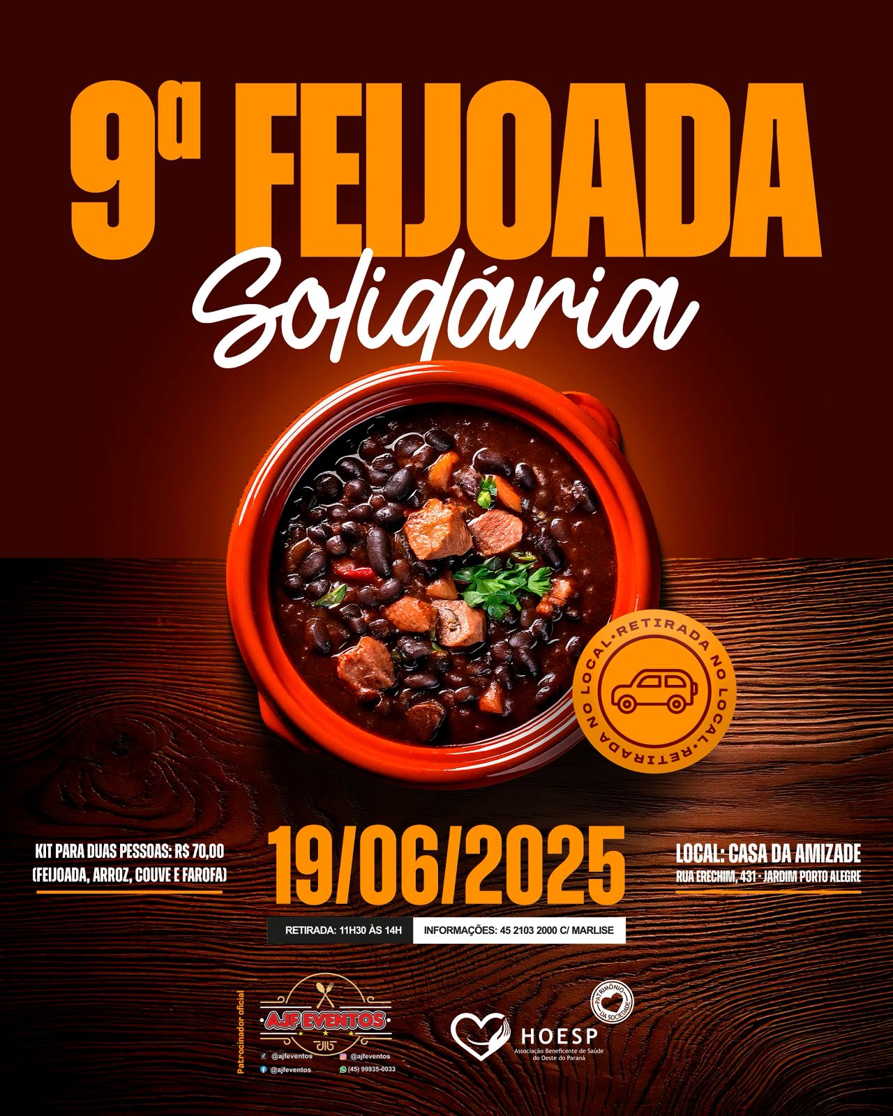 A 9ª Feijoada Solidária da Associação Beneficente de Saúde do Oeste do Paraná (Hoesp) - Hospital Bom Jesus já tem data marcada. Será no dia 19 de junho, na Casa da Amizade, localizada no Jardim Porto Alegre, em Toledo. Neste ano serão produzidos 500 kits e os ingressos já estão disponíveis para a venda na secretaria do hospital. “Os ingressos são limitados e por isso, recomendamos adquirir antecipadamente", disse a superintendente da Hoesp, Zulnei Bordin.