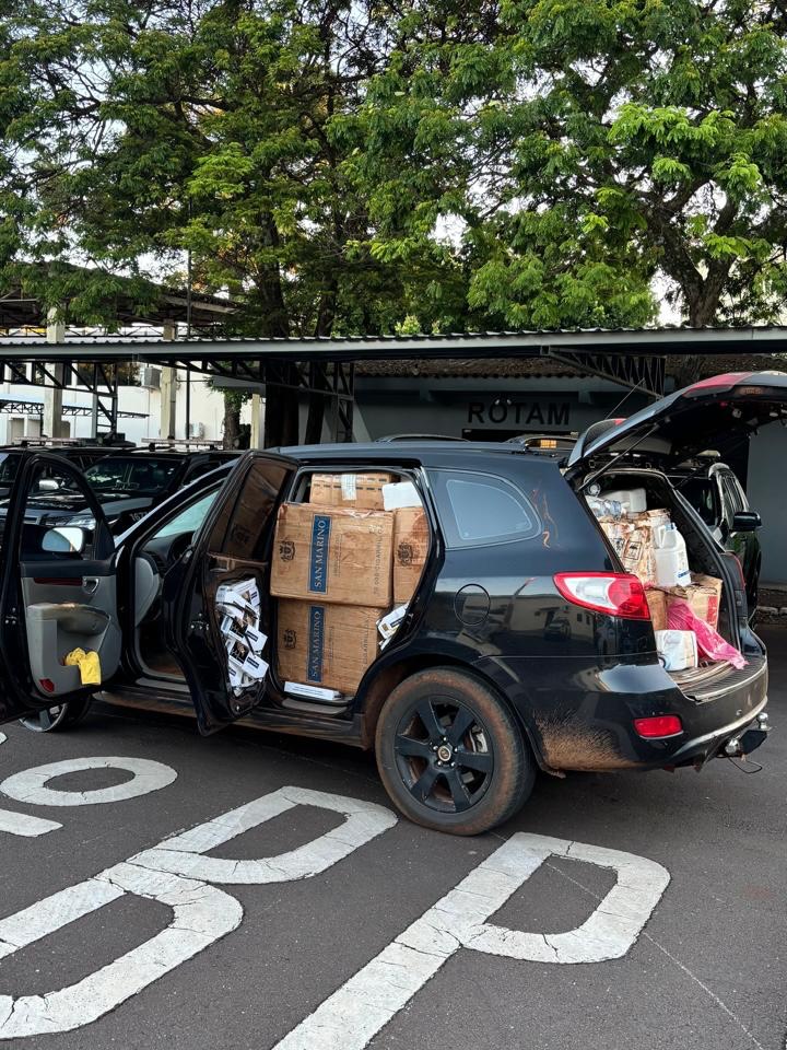 Uma ação integrada realizada na manhã desta quinta-feira (11) por equipes da Polícia Militar (PM), Polícia Federal (PF) e Receita Federal (RF) resultou na apreensão de uma grande quantidade de produtos contrabandeados no distrito de Vila Nova, em Toledo. Os agentes identificaram um veículo Hyundai Santa Fé, de cor preta, circulando em direção à área urbana com sinais de irregularidade e aparente sobrecarga no sistema de suspensão, o que levantou suspeitas de transporte de mercadorias ilícitas.
