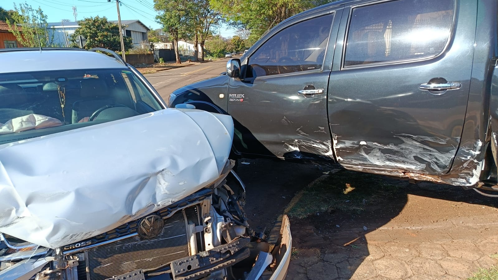 Os veículos tiveram danos consideráveis: a parte frontal da Saveiro foi bastante comprometida, enquanto a lateral esquerda da Hilux apresentou avarias de média proporção.