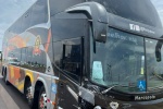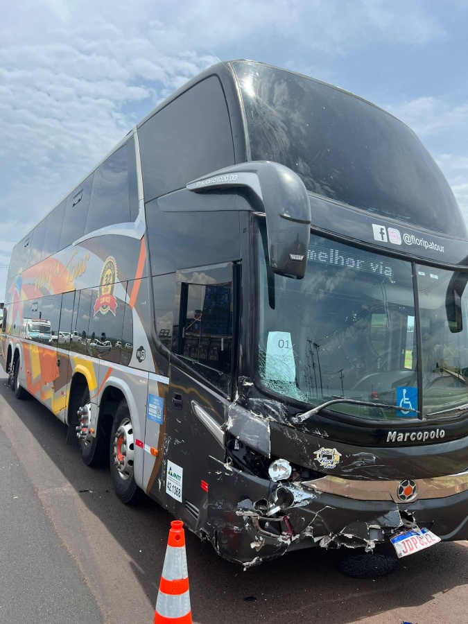 Conforme o relato inicial, o ônibus trafegava pela rodovia estadual, quando atingiu transversalmente a camionete que atravessava a pista. O impacto causou danos materiais em ambos os veículos.