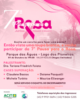A Associação Comercial e Empresarial de Toledo (ACIT) convida a comunidade para a 7ª edição da Pausa para o Rosa, um evento especial em menção ao Outubro Rosa, mês dedicado à conscientização sobre a prevenção do câncer de mama. O evento será no dia 1 de outubro, às 19h30, no Parque das Águas – Lago dos Pioneiros. Para a celebração, os participantes devem vestir roupas brancas.