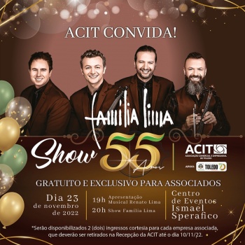 A Associação Comercial e Empresarial de Toledo (ACIT) realizará no dia 23 de novembro, no Centro de Eventos Ismael Sperafico um grande show com a Família Lima. O evento faz parte das comemorações dos 55 anos da entidade.
