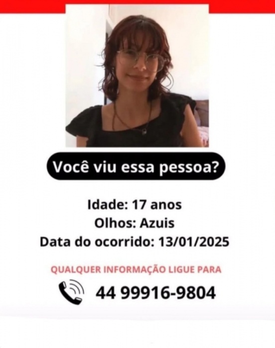 Informações sobre o paradeiro de Flavia podem ser repassadas via 190 (Polícia Militar do Estado do Paraná), 181 (Disque Denúncia do Estado do Paraná), 197 (Disque Denúncia - Plataforma Mulher Segura) ou ainda para o telefone e WhatsApp (44) 9-9916-9804.