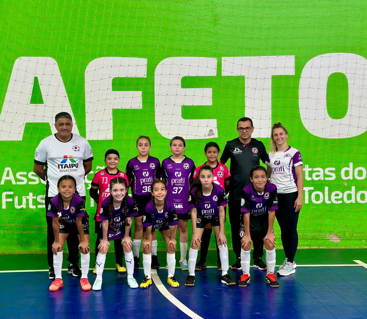 Também jogando em Toledo, as meninas da Afeto fizeram muito bonito na primeira etapa do Campeonato Paranaense Sub-13 e terminaram com 100,00% de aproveitamento, ou seja três vitórias em três partidas. O time toledano só aplicou goleadas, sendo elas sobre Laranjeiras do Sul Futsal (06 x 00), LS Sport (10 x 00) e Stein Cascavel Futsal Feminino (04 x 01).