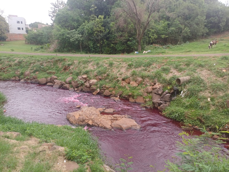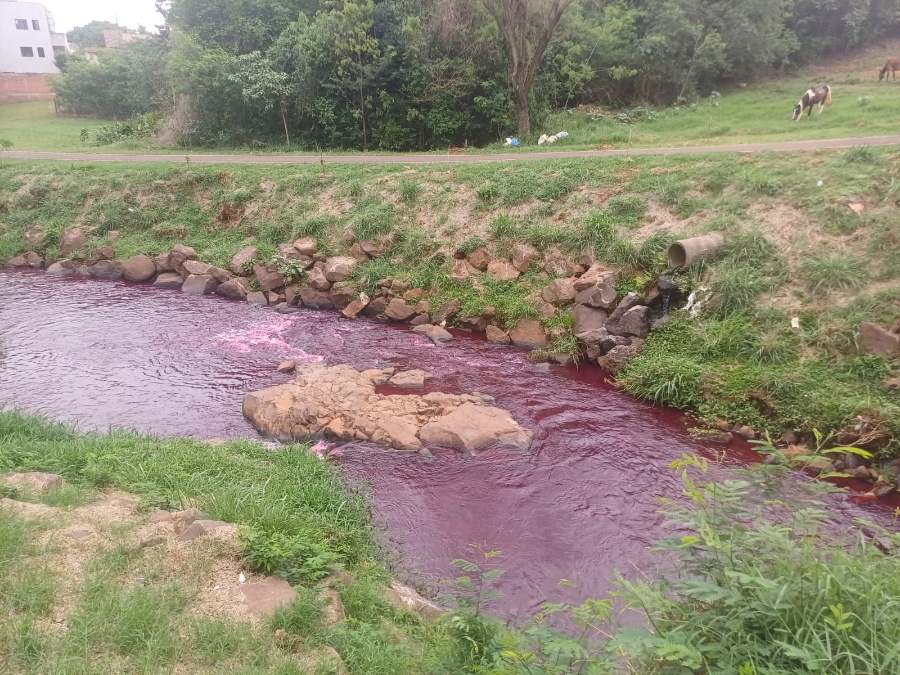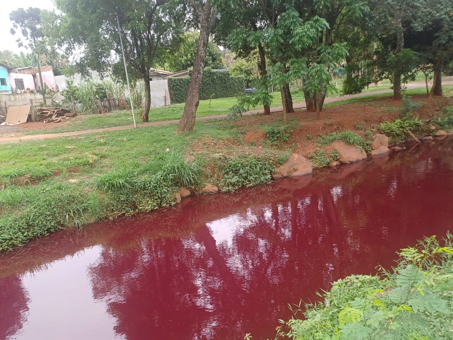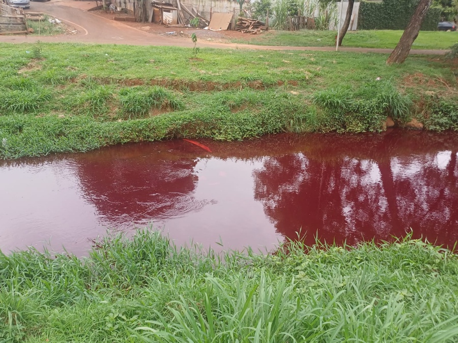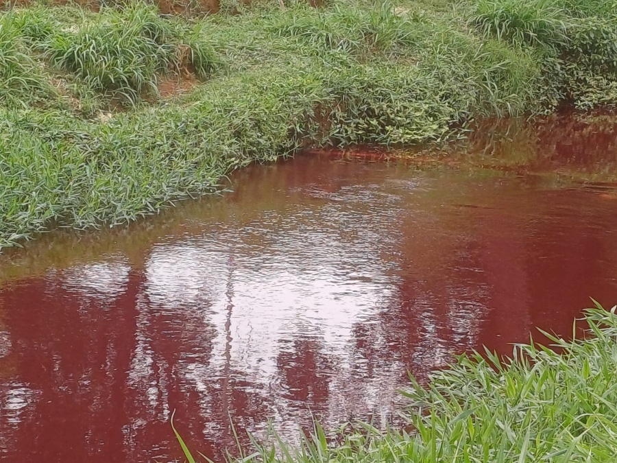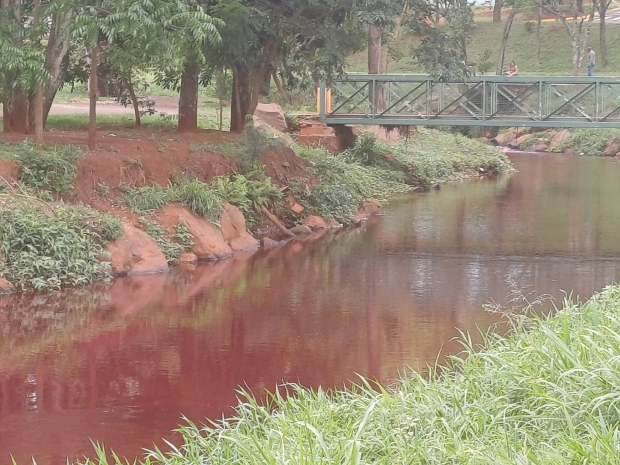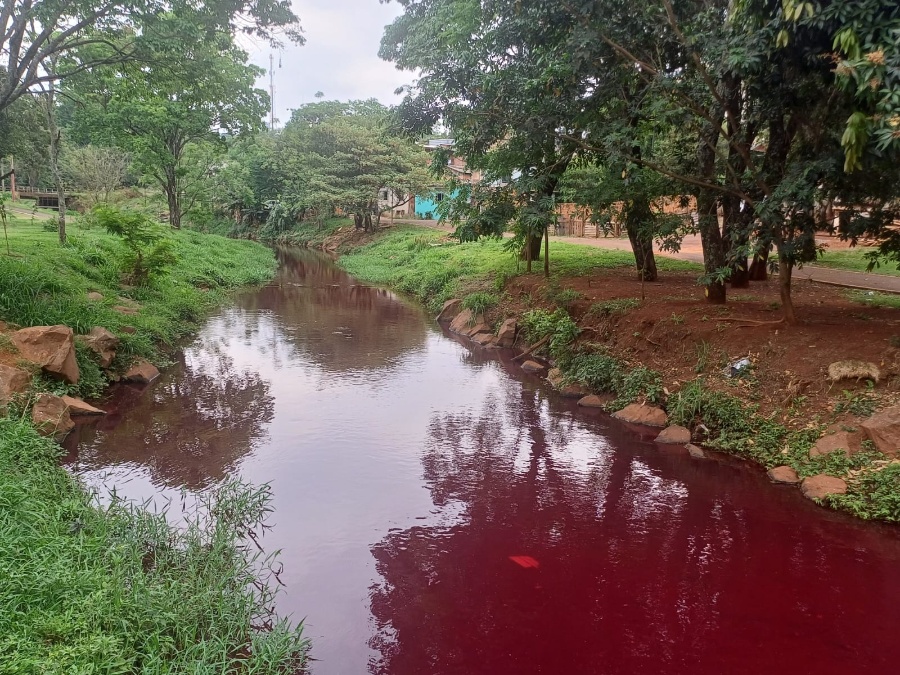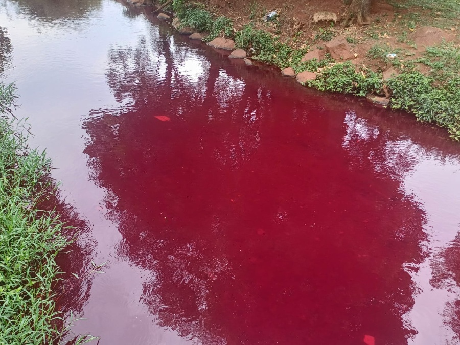 O rio apresenta uma coloração avermelhada intensa, gerando preocupação e curiosidade na população local, que registrou e compartilhou imagens do fenômeno.