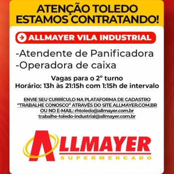 O Supermercado Allmayer, unidade Vila Industrial em Toledo, está com vagas abertas para contratação no segundo turno. As oportunidades disponíveis são para os cargos de atendente de panificadora e operadora de caixa. A jornada de trabalho é das 13h00 às 21h15, com 01h15 de intervalo.