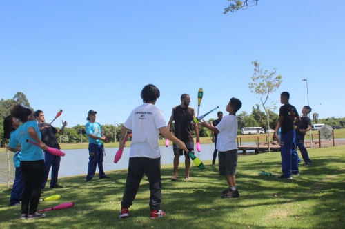 Alunos de grupos sociais de Toledo e que estão participando do Festival participaram neste sábado (05), de uma programação diferente durante a XVI Mostra de Circo Social e IX Festival Nacional de Circo. Foi um Café com Circo, no Parque do Povo Luiz Cláudio Hoffmann. Num dia bonito de sol, os grupos aproveitaram a sombra das árvores, na beira do lago do Parque para participar das oficinas de claves, bambolê e diabolo. Divididos em grupos de iniciantes e de avançados, eles treinaram sob a orientação de artistas mais experientes, que deram dicas sobre diferentes manobras com os aparelhos.