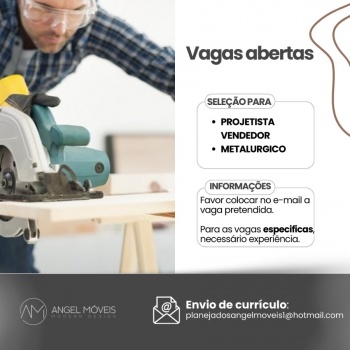 A Angel Móveis, situada em Toledo, está com vagas abertas para compor a sua equipe. As oportunidades disponíveis são para os cargos de Projetista Vendedor e Metalúrgico.