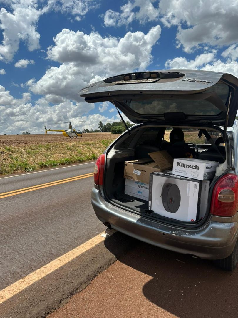 De acordo com as informações repassadas, após o deslocamento até o ponto indicado, o automóvel foi visualizado parado às margens da rodovia, enquanto a aeronave realizava sobrevoo de apoio no entorno. A equipe em solo procedeu com a abordagem do condutor, que foi identificado após busca pessoal. Questionado sobre o conteúdo transportado, ele afirmou espontaneamente que levava produtos eletrônicos oriundos do Paraguai no porta-malas do veículo.