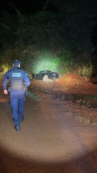 As viaturas iniciaram acompanhamento tático, e o veículo só foi interceptado após perder o controle em uma curva, onde a pista estava coberta de lama. Mesmo após o bloqueio, o condutor tentou se esconder em uma área de vegetação, sendo contido por um dos agentes, que ordenou o seu retorno à estrada.