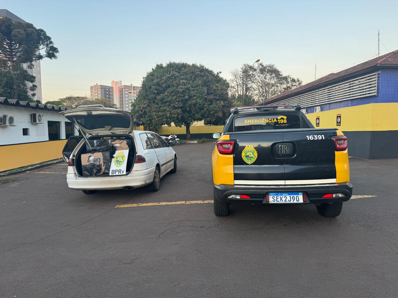 No interior do veículo foram encontrados 16 caixas de cigarros da marca Fox, de origem paraguaia. O automóvel era conduzido por um jovem de 20 anos, que estava acompanhado de um passageiro de 21, ambos paraguaios. Após a constatação do ilícito, os dois receberam voz de prisão e tiveram os seus direitos constitucionais informados. O uso de algemas foi necessário, conforme prevê a súmula vinculante de Nº 11 do Supremo Tribunal Federal (STF), para garantir a integridade da equipe e dos detidos.