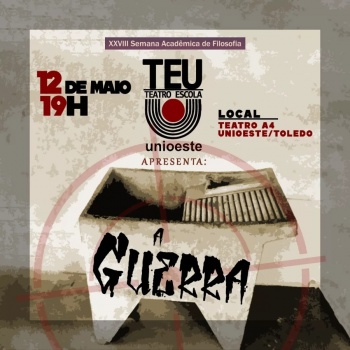 No dia 12 de maio, às 19h00, o grupo Teatro Escola Unioeste (TEU) apresenta o espetáculo A Guerra, no Teatro A4, no Campus da Universidade Estadual do Oeste do Paraná (Unioeste), em Toledo. A peça faz parte da programação da Semana Acadêmica de Filosofia e é aberta ao público.