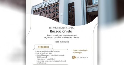 O Arca's Hotel, localizado em Toledo, está com uma excelente oportunidade de emprego para o cargo de recepcionista (vaga masculina). A posição é destinada ao turno noturno, com escala de trabalho 12x36, garantindo horários organizados e compatíveis para quem busca estabilidade e desenvolvimento profissional.