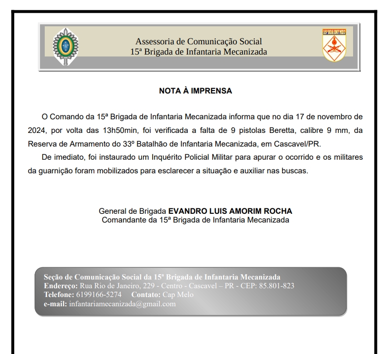 O 33º Batalhão de Infantaria Mecanizado (33º BiMec), em Cascavel-PR, está investigando o desaparecimento de nove pistolas Beretta, calibre 09 mm, de sua Reserva de Armamento. O sumiço foi identificado no domingo, 17, às 13h50, conforme nota oficial emitida pelo Comando da 15ª Brigada de Infantaria Mecanizada.