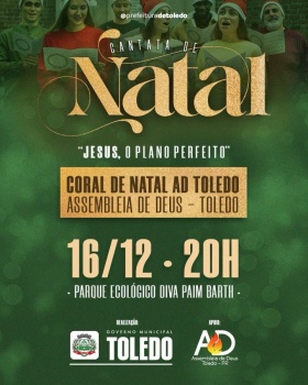 No sábado, dia 16 de dezembro, às 20h00, o Coral de Natal da Assembleia de Deus Toledo irá encantar o público no Parque Ecológico Diva Paim Barth (Lago Municipal) com o espetáculo "Jesus, o Plano Perfeito". Com uma duração prevista de duas horas, o evento promete transportar os espectadores para a atmosfera única do Natal, através de louvores e crônicas que retratam a essência da celebração.