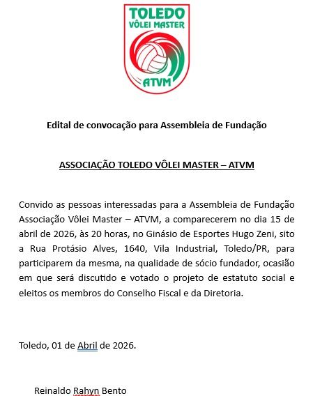 A Associação Toledo Vôlei Master (ATVM) convoca interessados para participar da Assembleia de Fundação da entidade, marcada para esta quarta-feira, 15 de abril de 2026, às 20h, em Toledo.