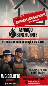 No dia 05 de outubro, às 12h00, a Associação Belotto, localizada na Rua Luiz Genari, Nº 27, no Jardim Gisela, em Toledo, será palco de um almoço beneficente com costelão e porco no rolete, cuja renda será destinada à reforma da Casa de Oração Irmã Nair.