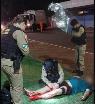 Ele apresentava ferimento grave na perna, com sangramento intenso. A equipe policial realizou torniquete no local, até a chegada do SAMU, que encaminhou a vítima ao Hospital Universitário, em código 3, considerado de maior gravidade.