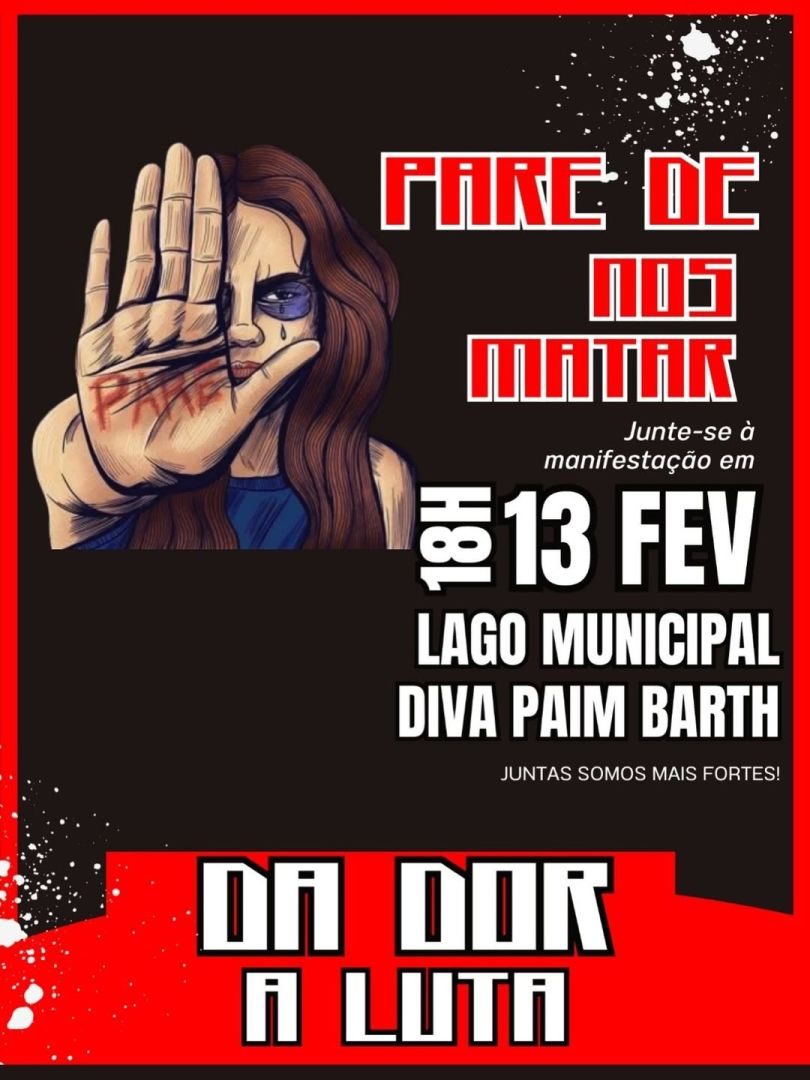 O Parque Ecológico Diva Paim Barth (Lago Municipal) será palco, na sexta-feira, dia 13 de fevereiro, às 18h00, do ato “Da dor à luta”, mobilização organizada em memória de Andressa Dani de Souza e como manifestação pública de conscientização e enfrentamento à violência contra a mulher.