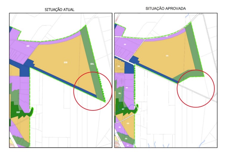 À margem da área residencial criada em 2024 (Lei de N° 2.858/2024), a proposta visa implementar uma Zona de Proteção Ambiental no raio de 500m entre a Zona Residencial e a empresa Coamo. Ou seja, na área delimitada (imagem abaixo), não será possível fazer o parcelamento de solo em lotes para edificações. “No ano passado, foi feita essa ampliação do perímetro urbano. Já tinha o processo com a Coamo. O Ministério Público interveio na situação, durante esse ano, pedindo para o Município fazer as adequações, a pedido da própria Coamo, que durante todo o processo da saída da sede, foi direcionada para lá por uma finalidade: para não fazer esse recebimento e gerar esses resíduos. Essa matéria foi levada ao Concidade e, durante os debates realizados pela equipe técnica e pelos demais membros, optou-se em reduzir o perímetro urbano (...) nesse raio de 500m, para garantir a segurança da Coamo para continuar no local e ter o zoneamento adequado”, explicou a engenheira.