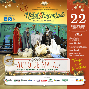 Pela segunda vez em Toledo, o Auto de Natal chega no dia 23 de dezembro à Praça Willy Barth, integrando a programação da VI edição do Natal Encantado de Toledo, a partir das 20h.