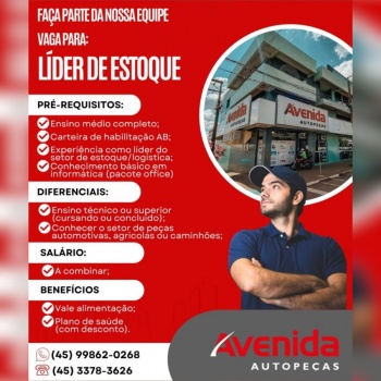 A Auto Peças Avenida de Toledo está com vaga aberta para o cargo de Líder de Estoque. A oportunidade é destinada a profissionais com ensino médio completo, Carteira Nacional de Habilitação (CNH) Categoria AB e experiência anterior em liderança na área de estoque ou logística. Também é necessário ter conhecimento básico em informática, especialmente no pacote Office.
