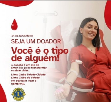 Neste domingo, 24 de novembro, o Centro de Hematologia e Hemoterapia do Paraná - Banco de Sangue de Toledo, em parceria com o Lions Clube Toledo Cidade e Lions Clube de Toledo, realizará uma ação especial no Parque Ecológico Diva Paim Barth (Lago Municipal), das 17h00 às 19h00, em alusão ao Dia Nacional do Doador de Sangue, comemorado em 25 de novembro. O evento busca sensibilizar a população sobre a importância da doação de sangue e fidelizar novos doadores.