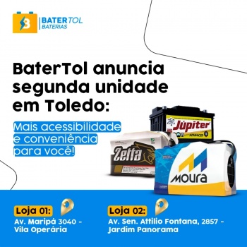 A BaterTol Baterias inaugura a sua segunda unidade em Toledo nesta sexta-feira , dia 12 de setembro, oferecendo mais acessibilidade e praticidade aos clientes.