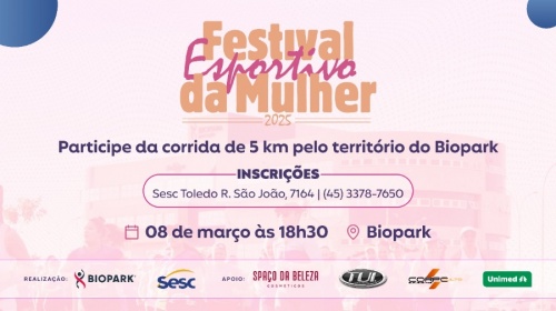 O 2º Festival Esportivo da Mulher promete ser um evento marcante para celebrar o Dia Internacional da Mulher com muito movimento e sensibilização. O evento acontecerá no dia 08 de março (sábado), no Estacionamento do Biopark Educação, com um percurso de 05 km, que pode ser realizado tanto por corrida quanto por caminhada, em uma parceria entre o SESC Toledo e o Biopark.
