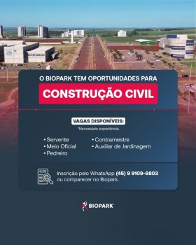O Biopark de Toledo está com vagas abertas para profissionais da construção civil. A oportunidade é ideal para quem busca trabalho no setor e possui experiência na área. Confira os cargos disponíveis: