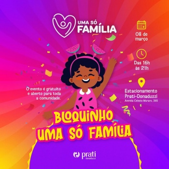 A farmacêutica Prati-Donaduzzi promove, neste sábado (8), o Bloquinho Uma Só Família, das 16h às 21h, no estacionamento da empresa, na Avenida Celeste Muraro, 365, bairro Tocantins, em Toledo.