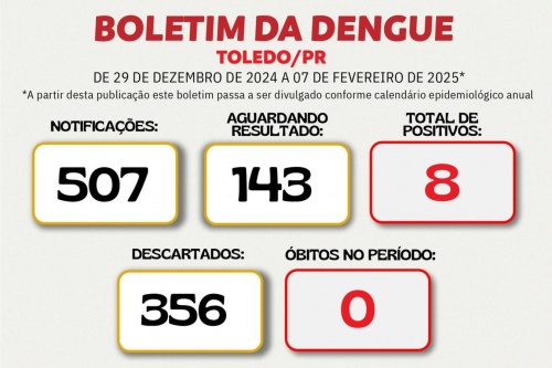 A Secretaria da Saúde de Toledo informa que, a partir desta sexta-feira (07), o Boletim da Dengue adotará o início do ano epidemiológico em 29 de dezembro de 2024, conforme indicação da Secretaria de Estado de Saúde do Paraná (Sesa).