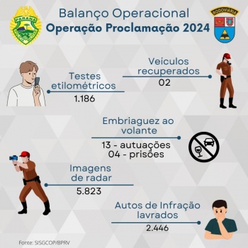 Entre os dias 15 e 17 de novembro, durante o feriado da Proclamação da República, o Batalhão de Polícia Rodoviária (BPRv) intensificou o policiamento e as fiscalizações para garantir a segurança nas rodovias estaduais. A operação resultou na emissão de 2.446 autos de infração de trânsito, incluindo 13 notificações pelo artigo 165 do Código de Trânsito Brasileiro (CTB) por dirigir sob influência de álcool.