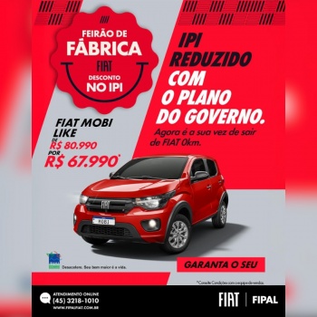 A Fipal Fiat de Toledo realiza neste sábado, 19 de julho, o Feirão de Fábrica com ofertas imperdíveis e condições exclusivas para você sair de carro novo!