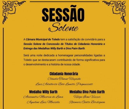 No dia 14 de dezembro, a cidade de Toledo completará 73 anos. Três dias antes, no dia 11 de dezembro, a Câmara de Vereadores irá promover a Sessão Solene de Concessão e Outorga de Honrarias para homenagear personalidades que contribuíram significativamente para o progresso local. A cerimônia será realizada no Teatro Municipal, às 19h00. Toda a comunidade está convidada.